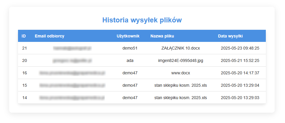Wszystkie wysyłki są zapisywane w systemie. Możesz je później przeglądać w zakładce „Historia”, aby mieć kontrolę nad tym, co zostało przesłane i do kogo.