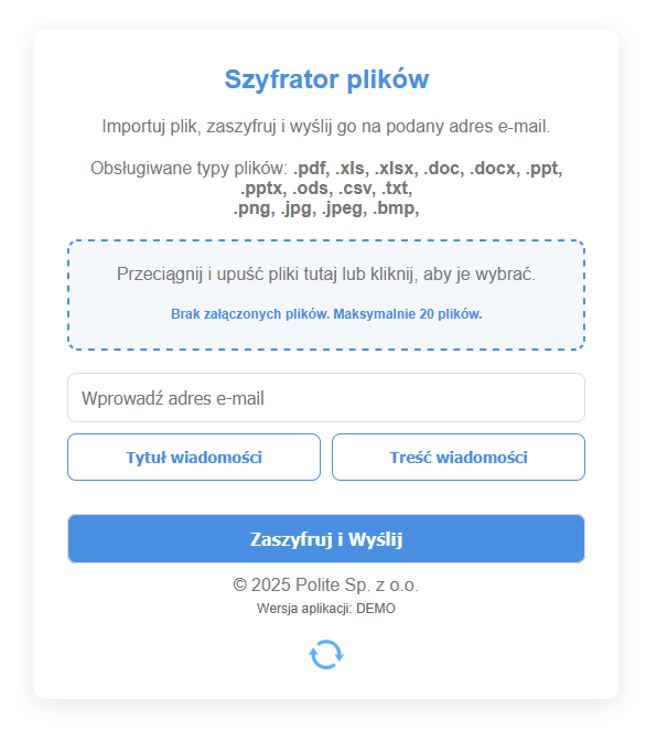Obsługiwane są m.in. pliki: PDF, Word, Excel, obrazy (JPG, PNG), tekstowe (TXT) i inne dokumenty biurowe. Łączny rozmiar nie może przekraczać 20MB.