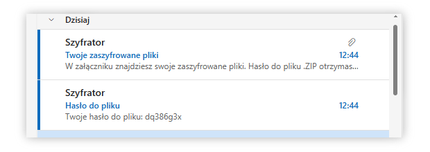 System tworzy archiwum ZIP zabezpieczone losowym hasłem, który zostaje wysłany e-mailem. Hasło trafia do odbiorcy w osobnej wiadomości – SMS-em lub mailem.